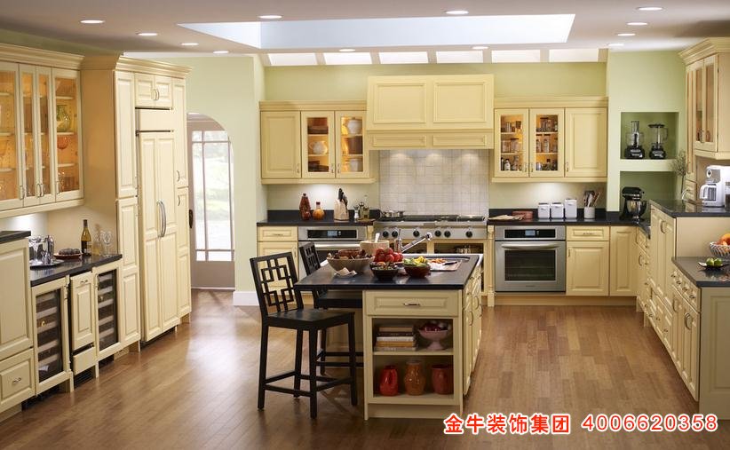 首先在厨房色彩的选择上,一般宜以白色、浅黄色和浅绿色为主。墙壁、吊柜宜采用白色。在洗涤槽柜,灶柜的门上采用浅黄色漆料,能增加明快感和宽敞感,再放上一些装饰的小摆设,增添生活的情趣。地板宜铺设浅绿色,浅黄色或白色的瓷砖,这样设计第一易打扫、第二整洁干净,第三如此协调的色彩,会使厨房更显统一、和谐。
