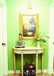 一般家庭装潢设计中开门就有一个 隔断 ,称之为玄关。在玄关处置放小桌(有半圆形或长方形,或开启孔洞),桌子上方悬挂镜子,或挂画,桌上放一只玻璃花瓶插花水养或插鲜花,从这里步入客厅,让人感觉到一种大方、优雅、恬静的气息。一般东、西方插花形式均可。