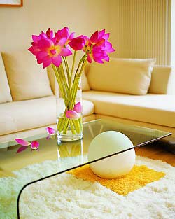 其实插花并不难,难的是如何用鲜花恰到好处地装饰居室,这里面就有学问了。现代人崇尚自然,在插花时可以将水果、蔬菜等节日必不可少的食品巧妙地融入花艺中,创造乡村原野的独特气氛,充分表现自然情趣。如客厅的空间较大,又是节日家人团聚的主要场所,可以选择一款花色热闹、花器高挑的插花摆在玻璃茶几上。上有花草,下有蔬菜、水果,通过玻璃的反射,整个客厅会显得活泼灵动。