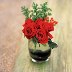 透明澄澈的小花器,瓶内哪怕只是几颗普通的石子,也能体现出瓶子的玲珑感觉。在弧线优雅的瓶形衬托下,简洁的雪松、跃动的火龙珠,衬着怒放的红玫瑰,有一种浪漫的非凡气质。