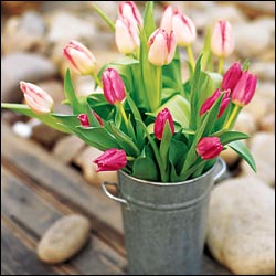 常被人忽略的铁皮桶,它的冷硬感就有了后现代色彩。高茎的玫瑰和郁金香,都极具女性柔媚气质,插在铁皮桶里,就像仙子在尘世的恋情,清新美丽。