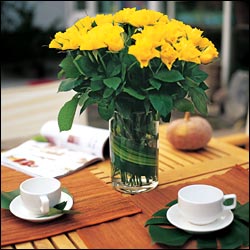 大棒的黄玫瑰适合宽口玻璃花器,试试用巴西木叶在花瓶内侧缠绕装饰,会带来不一样的效果。仿佛一个下午的阳光,都被它搞得温暖而宁静。