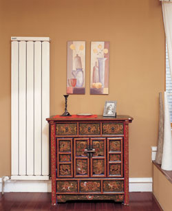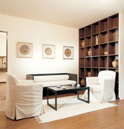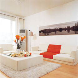 整个房间墙面上大面积空白并且横向长,于是选用一幅几乎与 沙发 同宽的黑白山水长画,一是切合气氛,二是与 沙发 形成平行构图。
