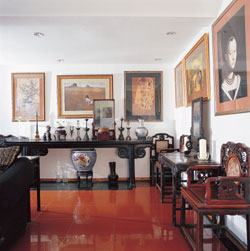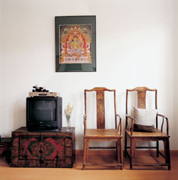 在休息区的一角,有两把中式的椅子,一个同样的柜子,上面是同样很中式的一幅挂画,在这个角落里,房主人就故意用了横凝重的手笔将此空间完全胶合在一起,看上去整个局部都如同一幅画。