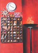 银色壁钟:立灯上的金属摆饰及银色的壁钟在暗红的墙面及木质框饰中跳脱出来。