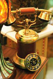 在一个漂亮的书架旁有一张华丽的书桌,上面摆放着一台古朴典雅的仿古电话。当你看到这个布景的时候,很容易产生一种身处高雅之家的感觉。这是因为有了它――浑身散发着高雅与尊贵的仿古电话。