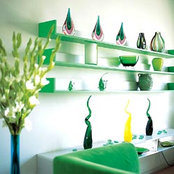 绿色调的搁板,上边同样摆设了绿色玻璃器皿装饰,让家更显清爽明快。