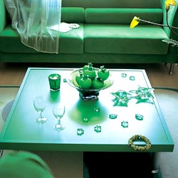 绿色茶几和 沙发 搭配,并挂上一袭白色窗纱,让空气更流通,视觉更通爽。