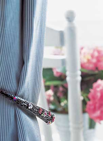 与花卉最搭配的 布料 图案是条纹和格子。这里就使用了蓝白条纹 窗帘 ,用一个印花发卡当做 窗帘 夹。夏天,有花卉图案的首饰都可以拿出来用做家居装饰。