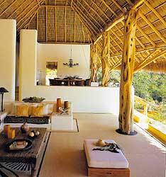 沙发 用洋灰直接砌成,地上是草料编制的铺垫,自然树干作支柱,一起经营出这种回归自然的感觉。 | |