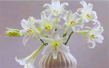 装饰的主角当然是百合了,这是最能体现节日喜庆气氛的花。到了冬季,其他的花卉在外形和质量上都不如夏秋两季,花形会显得比较小,比较单薄。而百合在市场上可以很容易买到,而且种类和色彩不比前两季少。寒风凛冽的冬季,花商们摆在自己摊位最显眼的一定是百合。现在花市上的百合可谓是争奇斗艳。最受人们喜爱的西伯利亚和卡萨布兰卡此时更是傲视他花,以自己特有的香气和大大的花形成为最受欢迎的品种。如凝视星空、钦差、铁炮等品种,也都因为不同的花型和颜色成为人们冬季装扮居室不错的选择。