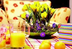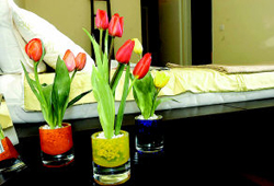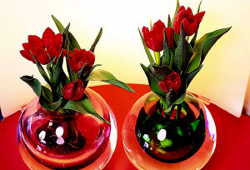 方法:用原来盛色拉的盘子来盛上郁金香,再用时下流行的水晶花泥来掩盖住郁金香的球根,这样可以给花的发育提供足够的水分和养分,郁金香也在水晶花泥的衬托下显得更加娇艳。在餐桌上摆放这样一盘“鲜花色拉”,一定会让人食欲大增,正可谓是“秀色可餐”。