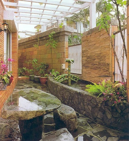 三角形空间因地制宜安放石桌、石凳,小桥流水,充满乡土气息。