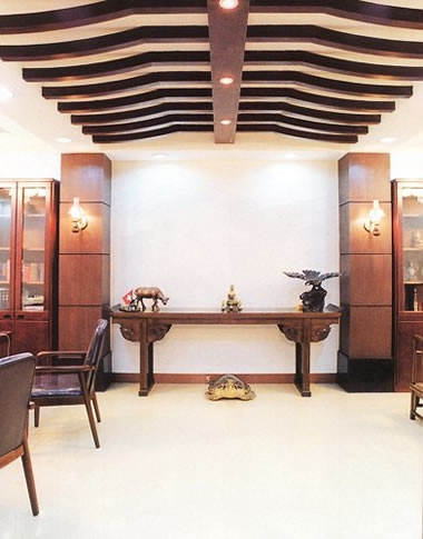 红木家具,加上布艺 沙发 ,复式造型的天顶,都越发显出客厅的雍容大度。