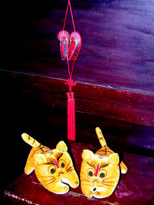 中国结和各种中式装饰也是我最爱的风格之一。鲜红小巧的鞋子和安徽宏村买来的纪念品挂在古旧的柜子上,相得益彰。另外,在一边的小柜子上放两个从山西带回来的手工布老虎,因此有朋友把房间的这一角叫做“中国角”。各种旧式的锁具也是我的藏品。