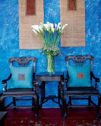 硬朗的仿古硬木家具让安静的家居端庄、冷静,蓝色现代的背景墙却是一片生机与动感。不施粉黛的白色马蹄莲以葱郁的生命语言迎合着氛围,而它的花语热情,则让典雅与和谐含笑而来。