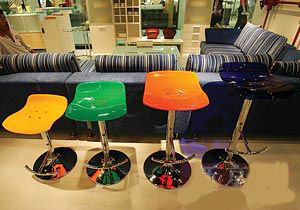 丰富的色彩,让人迷恋,这是造型家具中不可或缺的关键点,因为多样的色彩可以让你在不同的配搭中享受色彩变变变的游戏快乐。这组吧凳,红蓝黄绿的明艳色彩,买一个总觉得单调,要买就买一组,一字形排开那才对了味。它们除了颜色不一外,高低还不相同,仿似五线谱上的那些蝌蚪音符,你可以开动脑筋来体验这场排列游戏。