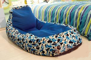 带气垫的家具,除了让你享受非凡的柔软之外,还能让你随心所欲折腾它们。这款船形的休闲 沙发 ,外观看上去仿似游乐园里的气垫船,但 沙发 边沿仿蟒蛇皮的设计、蓝黑花纹环形充气条以及末端高高翘起一角,又像是一条大蟒蛇。由于 沙发 里填充了许多泡沫颗粒,使得 沙发 非常轻,用手就能将它掂起,方便放置家中任何位置。