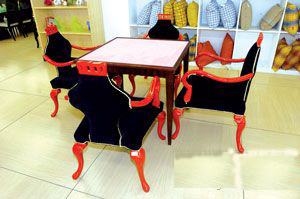 这套麻将桌椅,具有王者气势,其滑稽搞怪的设计让家常游戏的玩乐精神不言而喻。黑、红、粉、金大气凝重的色系,搭配柔媚的桃红,庄重中透露出嬉皮享乐的味道。更搞笑的是那些椅子模拟皇宫里贵族人物的形态,椅背、扶手上的造型模仿得十分相似,叫你怎么看都忍不住要来这里坐坐试试今天的运气了。