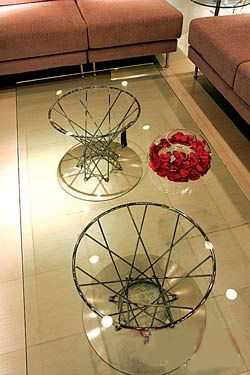 造型家具中,组合,拼装,或不规则的造型,这类简单的“游戏”已经落伍,让家具充满想象力的设计风头正劲。极具游戏精神的设计给你带来丰富的联想。就像这款茶几,简单的玻璃与不锈钢材质组合,色彩单调简洁,但以篮球场上的投篮筐作为茶几的两个支架,绝妙的创意让你会心一笑。