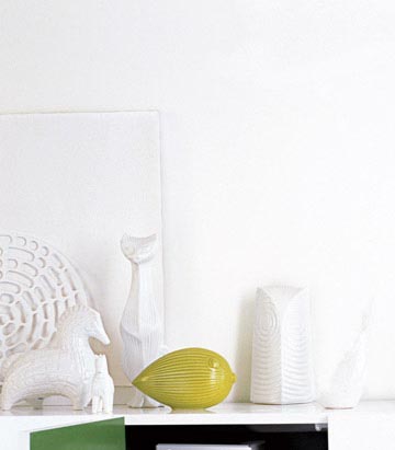 脱颖而出 在一组单色的装饰物中放置一个彩色的,使其成为一个白色系中的焦点。将柜子门的里面变换一种颜色,这样即使偶尔柜子门没有关严,露出它们,反而成为一种装饰。