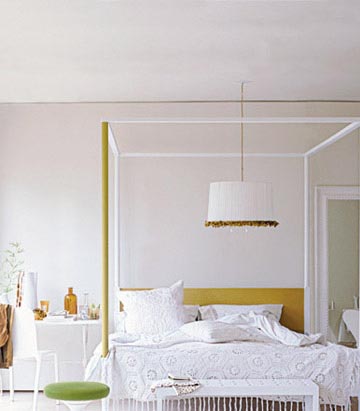 局部上漆 惹想尝试使用颜色,一个低风险的方法就是只把家具的某个部分上色,其余保持白色,比如这个绿色的床拄,或者给小凳子加上一个套子。如果厌倦了,你能随时重新上色,或者维持灯罩的颜色以及那根相搭配的电线,只是给灯罩加上饰边和水晶吊坠。