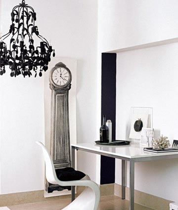 黑白经典 用混搭的风格来更新经典的黑白搭配。一条简单的黑色长条色块增加了角落的深度,本来容易被忽视的角落反而成为了居室里的亮点。其它配饰的选择除了颜色非黑即白之外,最好选择不同的材质和质地,这样就会有既丰富又单纯的效果。