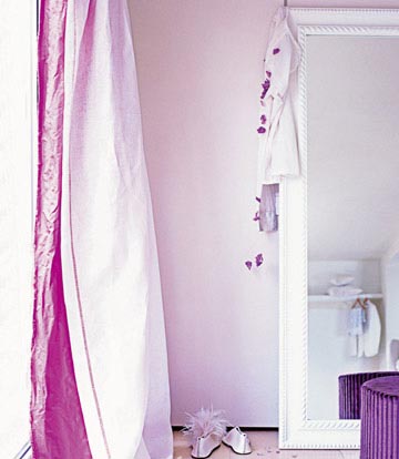 双色窗帘 全白的亚麻窗帘衬上一层奢华的紫罗兰丝绸,魅力即现,为配合浪漫的紫色调,丝绒座墩、 衣服上的配饰,都选用了不同深浅的紫色系。