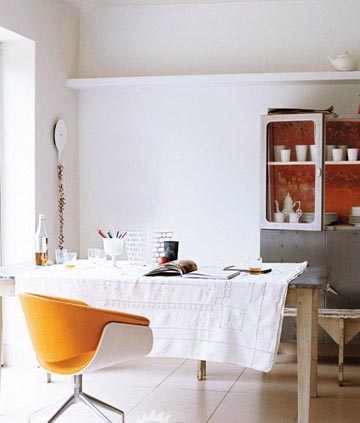 橙色冲击 一把极具风格的橙色椅子和橙色材质的橱柜使实用的厨房凸显性格。精致的亚麻提花的旧桌布既遮盖了有些磨损的桌面又给厨房带来些许温和雅致的气质。现在厨房在不做饭时,也可以被用来看书或 者思考了。