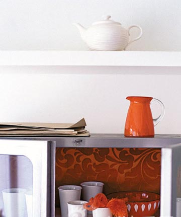 协调统一 用鲜亮图案的材质或墙纸来重新装饰橱柜,这是一个简单易行的制造冲击力的方法。用当代风格的墙纸、壁布,甚至是印刷品都可以,将它们贴在橱柜里面、柜门上或者干脆就贴在外面。但最好和整个空间的风格和色调相协调。