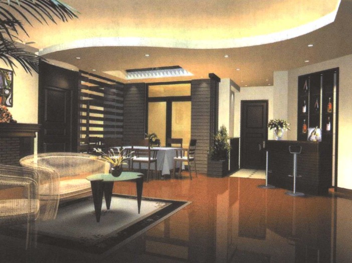 (2)客厅兼餐厅。餐厅与客厅合并是现代家居最常见的。由干客厅的用途较多,占用面积也较大,餐厅往往只占其中一隅,设计上必须注意分隔技巧,可从地板着手,将地板的形状、色彩、图案、质料分成两个不同部门,餐厅与客厅以此划分形成两个格调迥异的区域,也可通过色彩和灯光来划分;在视觉上轻而易举地造成两个不同区域,可给人带来视觉上的美感。又保持空间的通透性和整体性。