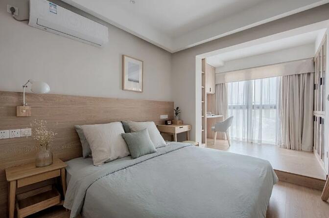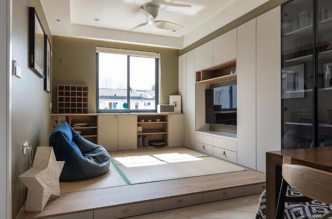 卧室阳台并入室内,做地板,不仅可以增加存储空间,而且是一个很好的休闲区。如有必要,还可以设置工作区。