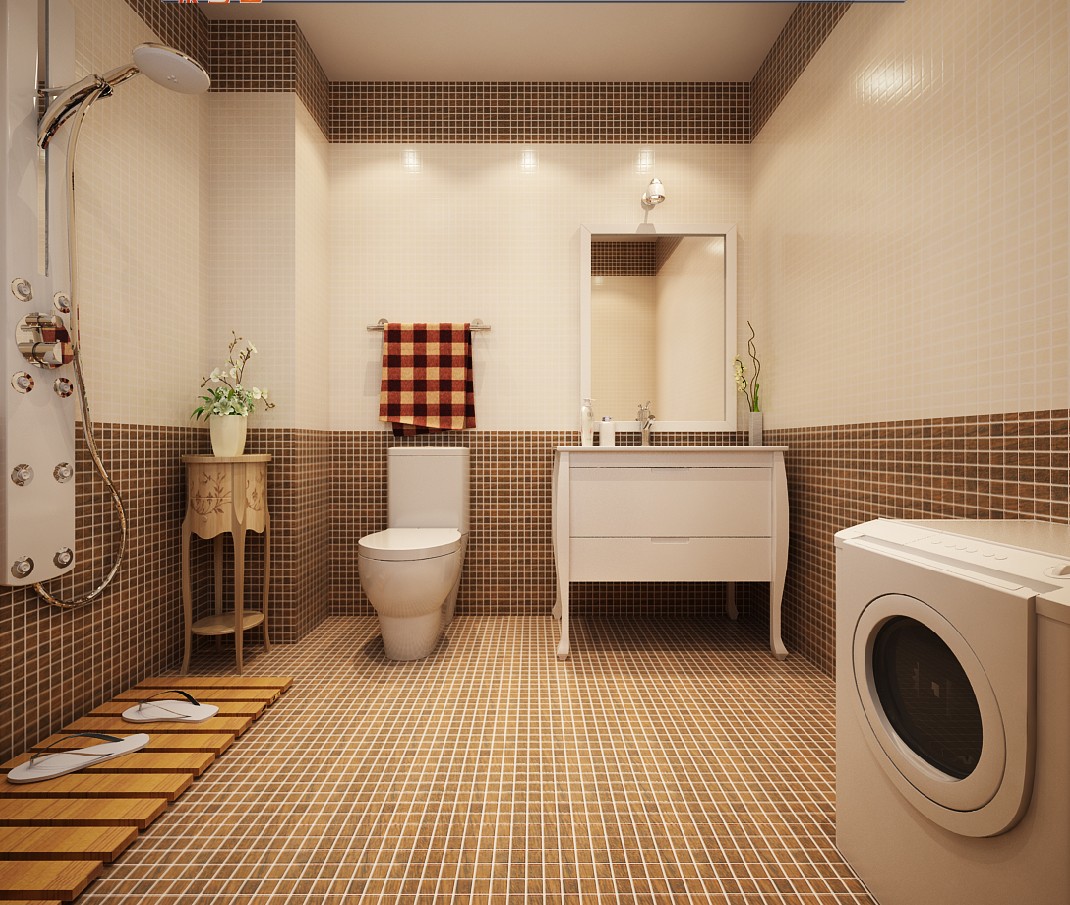 卫生间在家庭居室中占有重要的地位,应该营造出一种洁净、明亮、温柔的环境氛围。卫生间设计通常为三面墙壁,白色瓷砖铺砌到顶棚,门窗镶磨砂、磨花或蚀刻彩色玻璃,橱架以不锈钢材料制作,台板用厚玻璃,以增加透明度,避免充塞空间。防潮灯以柔和奶白的光度照明,镜子外面镶玻璃罩,便于及时清除水雾。地面铺防滑地砖,坐便桶和洗脸盆前,地面铺泡沫塑料地巾。给排水、喷淋器安置适宜,便于取用。还应考虑排风、换气装置,以保证洗浴时呼吸舒畅。也可单设蒸汽喷雾淋浴间,耗资虽然高一些,但给人却是一种高级的享受。