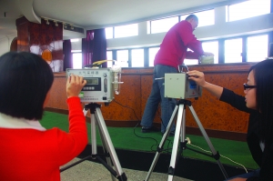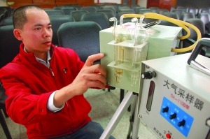 工程师正在给会议室采样。 工程师正在检测。 工程师采样进行比对。