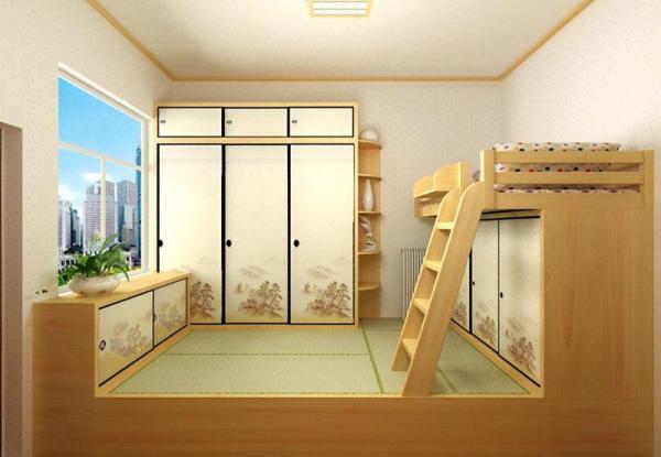 如果选择榻榻米双层床,如果房子高度很高,可以将榻榻米高度设置为30-40;如果房子高度正常,可以设计成比地面高15-30cm;房子很短,可以设置在10cm左右。