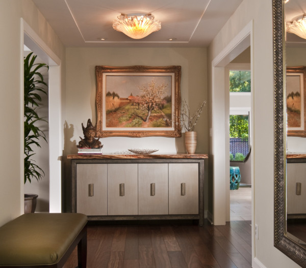 4.巧妙运用照明塑造玄关美感。如果光线不足,可以在玄关安装嵌灯设计。这种设计的巧妙之处在于,它的照明效果不会减弱或刺激眼睛。因为是嵌入式的,高度就够了。如果玄关有一些挂画或者艺术品,可以用聚光灯装饰。