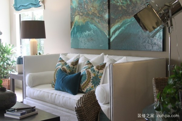 3.绿白交织,形成强烈的色彩冲击感。同时,书房的位置也可以在小户型空间中腾出。设计师也充分利用了空间。书柜旁边还预留了一张沙发床。必要时,书房也可以用作客房。休闲沙发的摆放和木质三角形圆形茶几,让业主在业余时间坐下来看书,喝杯茶。