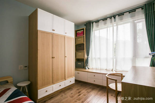 2.孩子的卧房,主人采用了明丽的色调来装饰房间,整个看上去非常的清新、明亮。由于飘窗的面积比较窄,保留原始形态的话有点浪费,所以就在底部设计收纳柜,再铺上彩色的小垫子,搭配小碎花的窗帘,就变成了一个充满浪漫氛围的小角落。