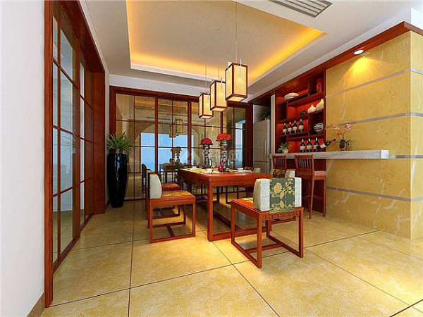 现代中式装饰更注重空间的层次感,在设计中将根据家庭人口和功能空间的隐私程度进行合理的分离。例如,现代分区设计在新中式风格中的表现是哑口、博古框架等实践,如果隐私程度较高,将使用屏幕、窗格等屏蔽分割,更具中国特色和层次之美。
