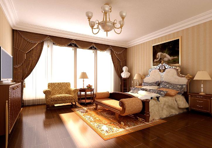 主卧里的陈设相对简单,但是床头的手绘图案和吊灯,非常引人注目。